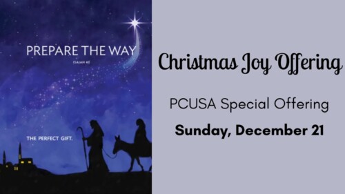 We will collect the Christmas Joy special offering on Sunday, December 21. This offering provides assistance to current and retired church workers and also goes to the Presbyterian-related schools and colleges.